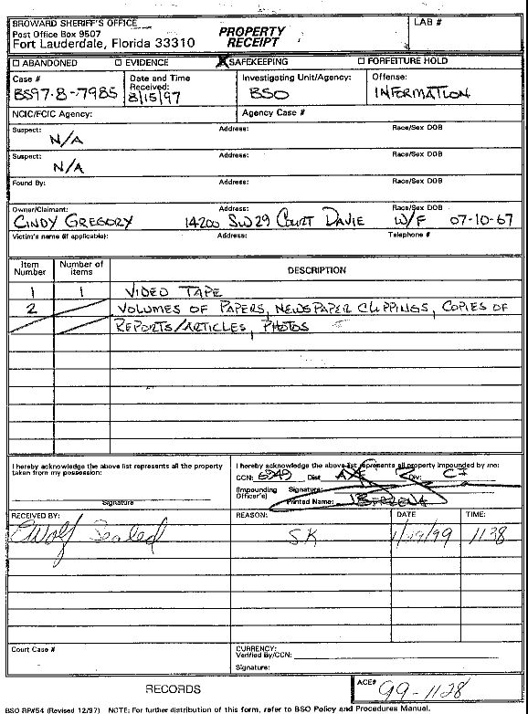 The (exculpatory) property below was received August 15, 1997, but not logged into Evidence until January 19, 1999, 1-1/2 YEARS LATER, and almost TWO MONTHS AFTER a trial ended. Detective John Berrena had nothing to do with the intake of the original property, and Cindy Carol Gregory swore under oath in deposition (page 123, lines 9 through 16) that she had no contact with Berrena, except by telephone. She also admitted that the Plaintiffs committed perjury.